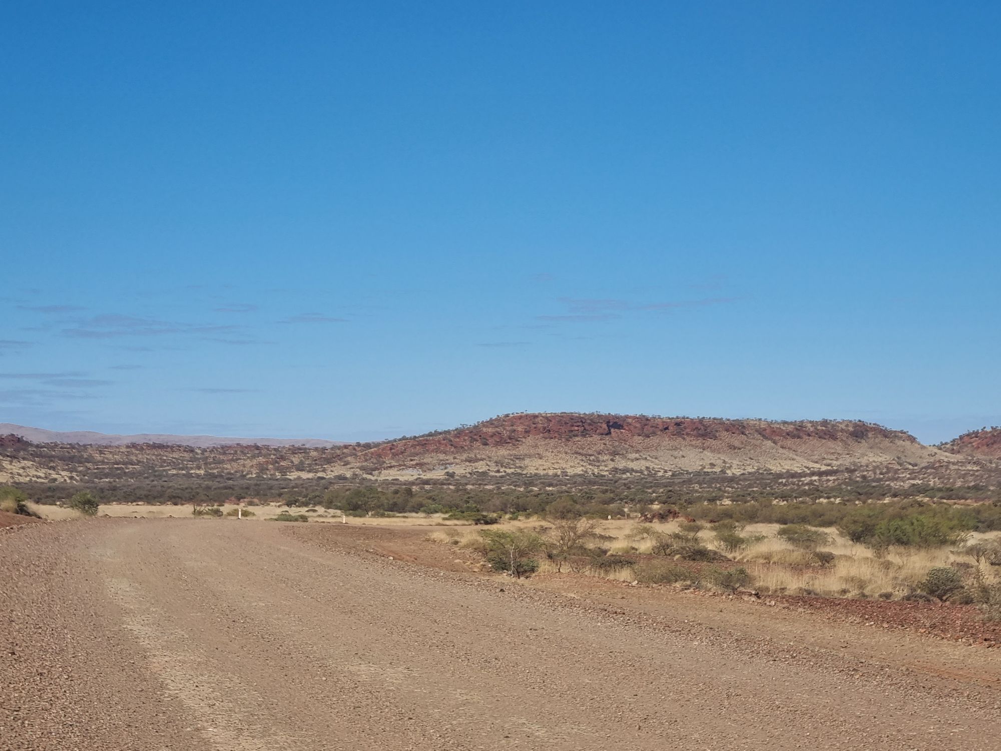 True to his word, after around 8 km, the corrugations ease, then the red dirt gives way to decent gravel and its mostly smooth sailing. Some interesting backdrops too.