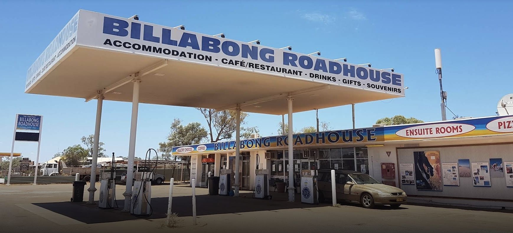 Continuing on for another hour, I'm back on the highway. My fuel economy has skyrocketed with the headwind to 5.9L/100km (I wonder what its doing for the caravan convoys), so I pull in at Billabong and fill up. Apparently a bit of a landmark, having been serving fuel since 1962. Shrug.