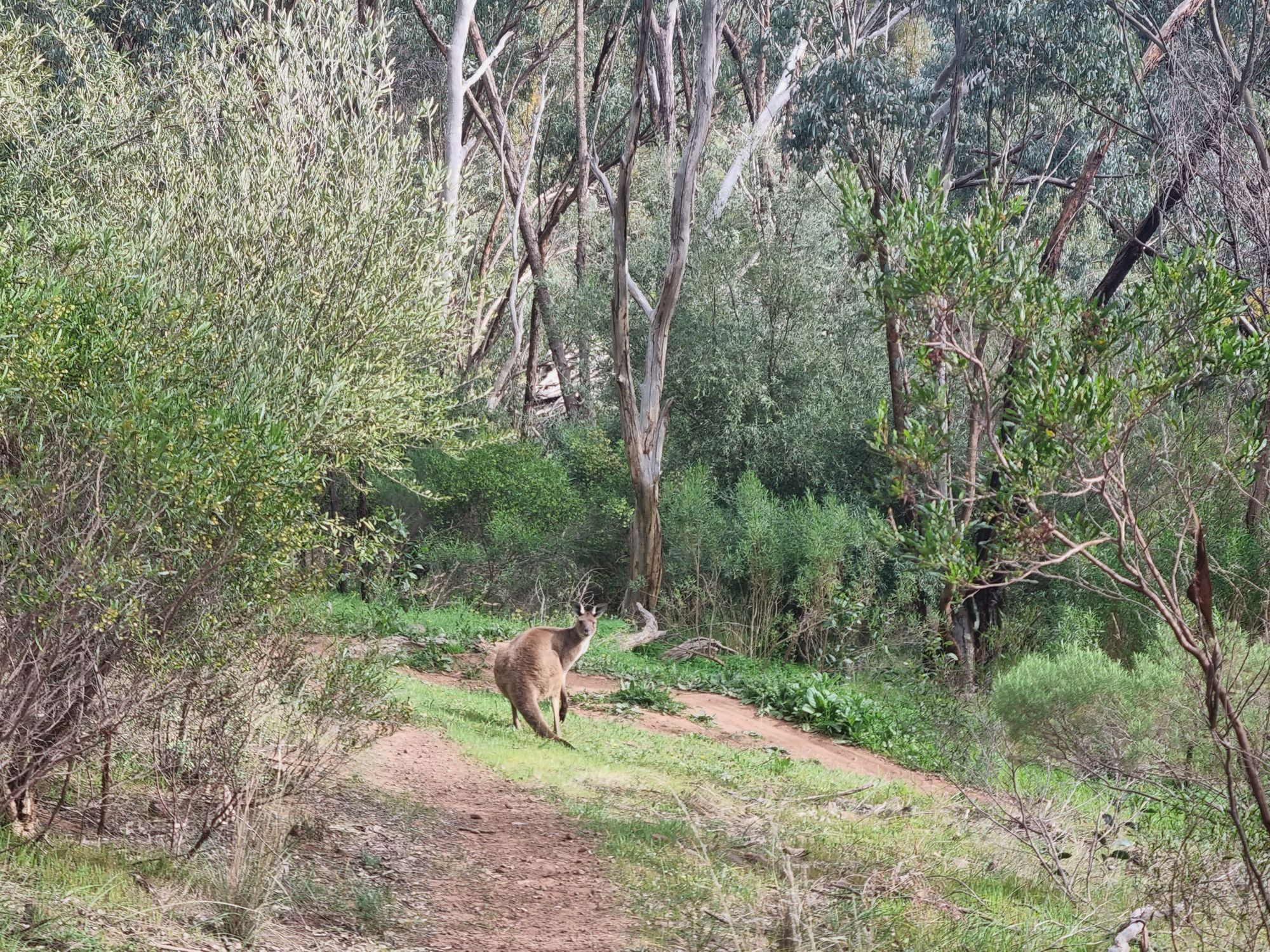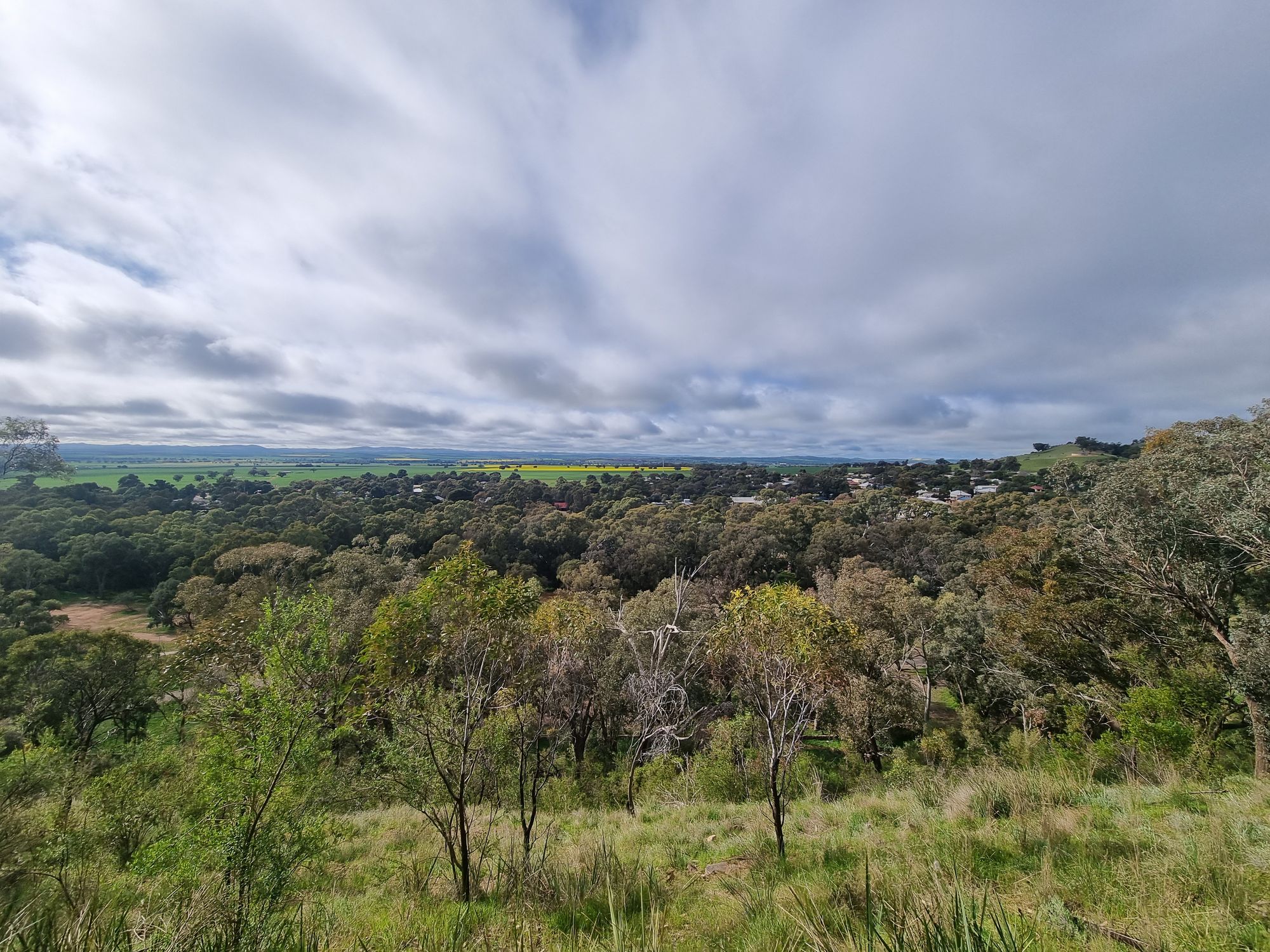 I bail on that plan and opt for a loop walk around the lower hills. There's a lot of birdlife already awake for the morning and a fair bit of colour in the flora. I summit the first hill and look back toward Melrose.