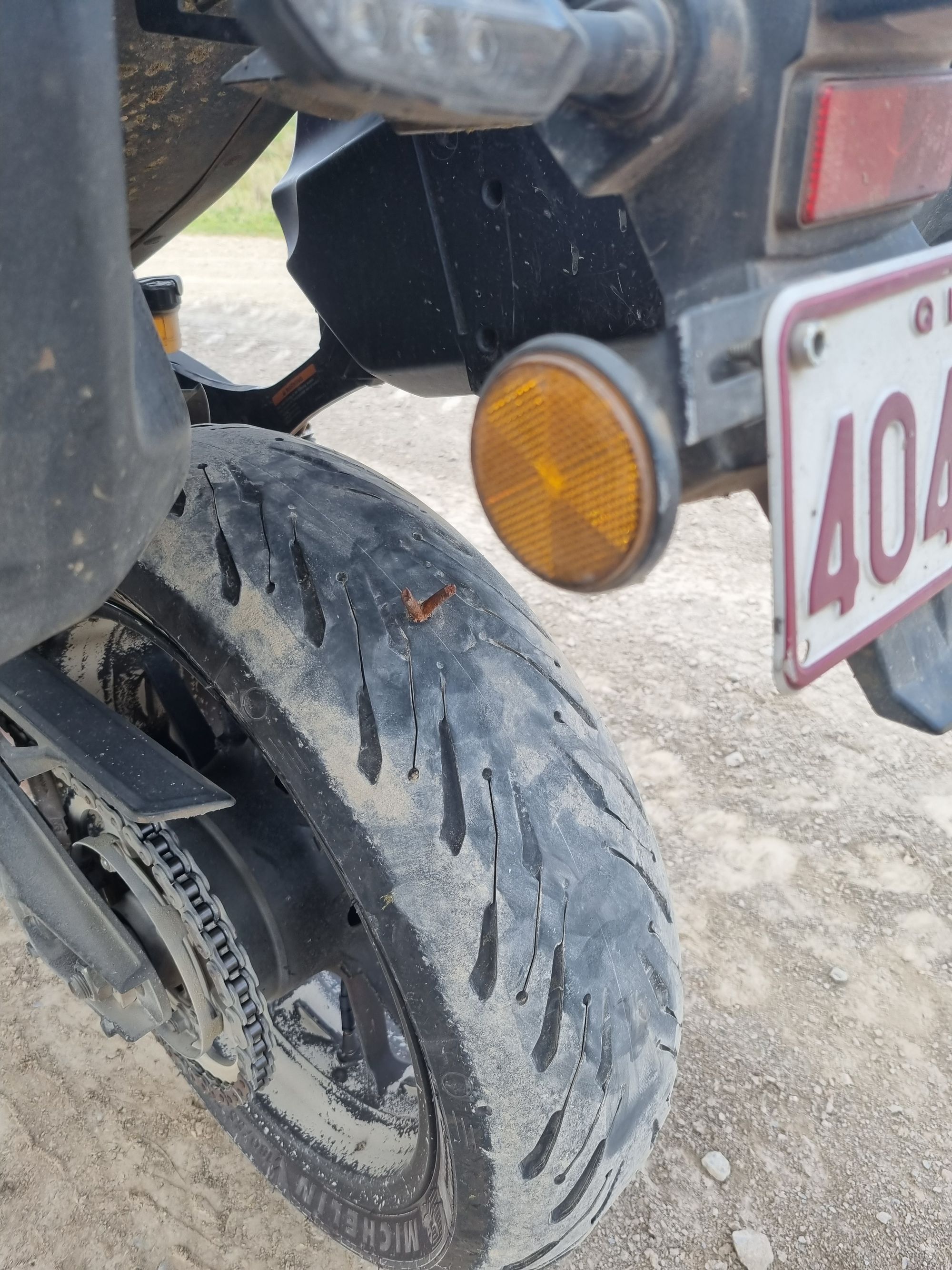 Twenty kilometres of dirt later, though, it seems the universe has decided my fake, modern attempts at "exploration" needs some rough ground. I feel the back tyre dig in, and immediately know the feeling of a flat tyre.